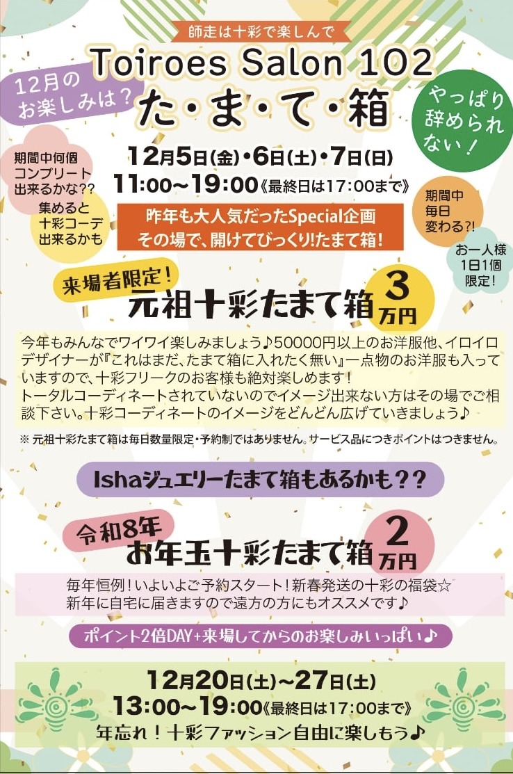 デザイナーがこれはまだ、たまて箱に入れたく無い一点物のお洋服も入っていますので、十彩フリークのお客様も絶対楽しめます!トータルコーディネートされていないのでイメージ出来ない方は、その場でご相談下さい